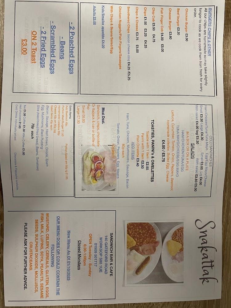 Located at 140 Gateford Rd, Worksop S80 1UE, Snakattak blends the essence of home cooking with a casual dining experience. Nestled in a community-centric area, this cafe thrives on its reputation for exceptional service and quality food. The establishment is easily accessible, featuring wheelchair-friendly entrances and facilities. Parking is a breeze with free street parking available, making it convenient for locals and visitors alike. Snakattak’s commitment to quality shines through, not just in their food but also in their inviting decor, which provides a cozy backdrop for meals shared with family or friends. Regulars rave about the attentive staff who prioritize customer satisfaction, ensuring that every visit is a pleasant one. Their popularity among tourists and locals alike speaks volumes about the high standards upheld throughout the years.